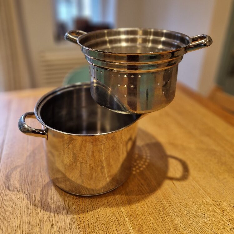 With built in colander. Also a useful large saucepan, especially for bigger vegetables