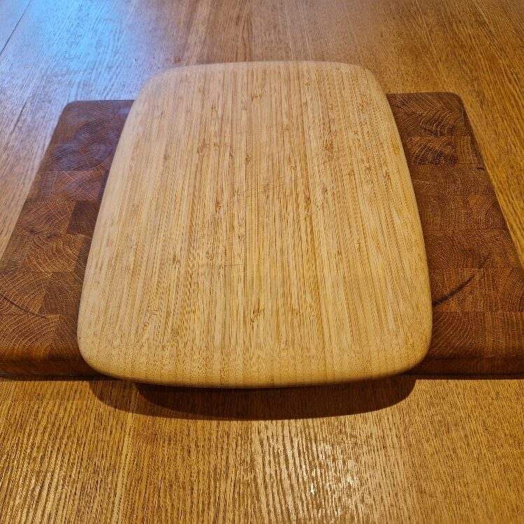 We prefer heavy, wooden chopping boards as they are sturdy and don’t blunt knives. But you can use bamboo or plastic too